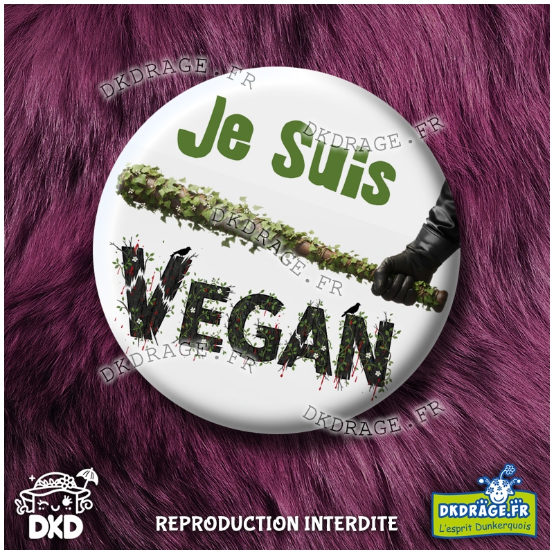 Ce badge "Je Suis VEGAN" détourne avec humour l'univers de The Walking Dead, avec une batte (Lucille pour les intimes) revisitée. Parfait pour les militants du végétalisme (ou pas) qui ont de l'humour !