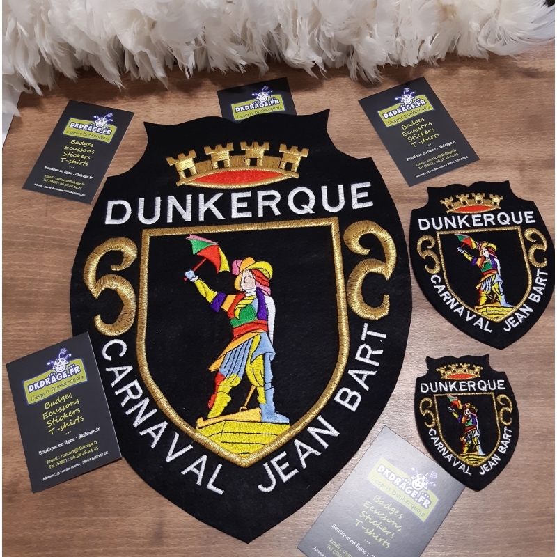 Superbe écusson brodé très coloré, à coudre ou coller sur votre clet'che, représentant notre héros Dunkerquois, Jean Bart le célèbre corsaire célébré à chaque rigodon, trois tailles existantes : Standard (8,1x6,0cm), Grand (12,1x9cm) et Géant (31,5 x 23 cm).